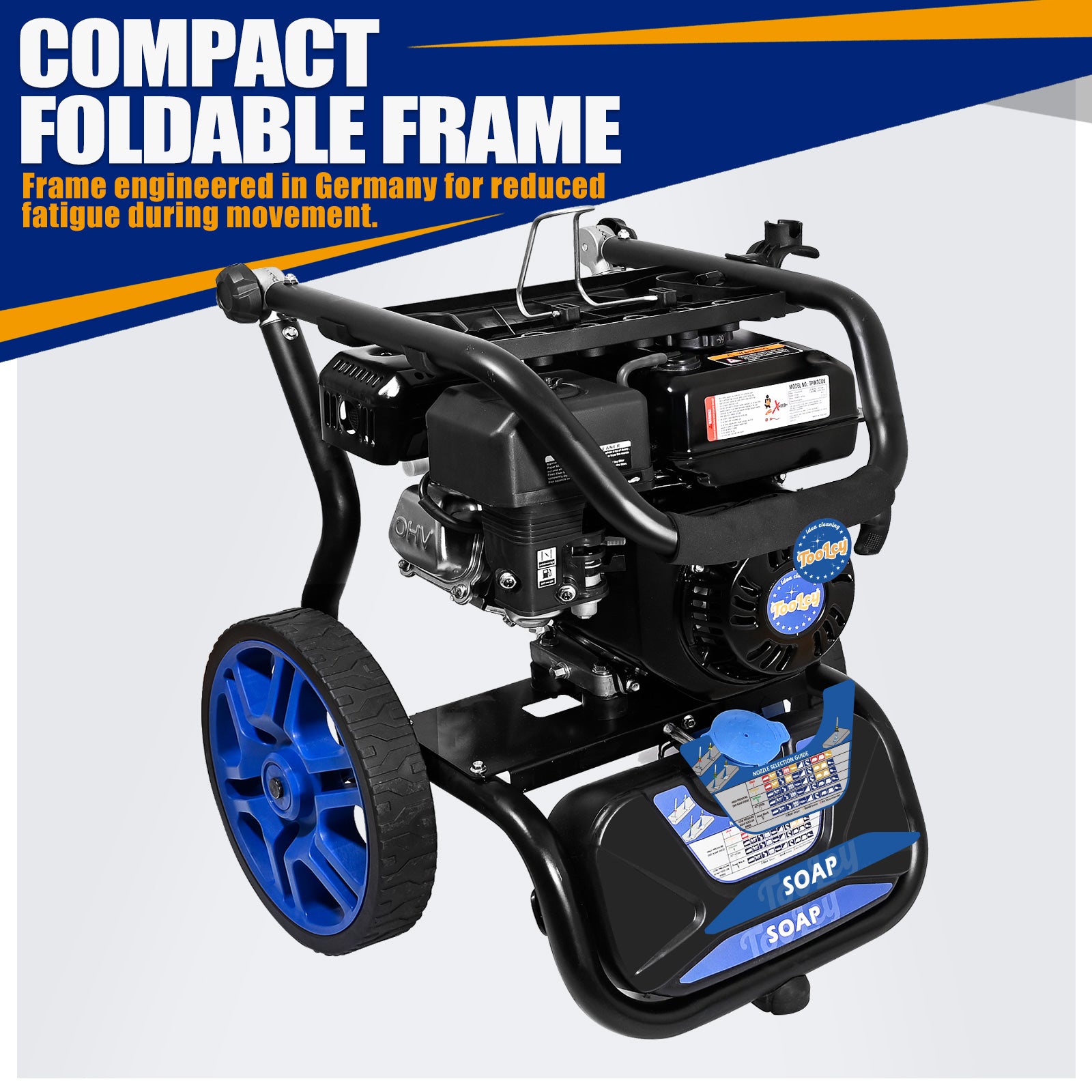 Premium Accessories: Includes a 30ft pressure hose, ergonomic spray gun, steel extension wand, and 5 quick-connect nozzles. Onboard storage keeps everything organized.