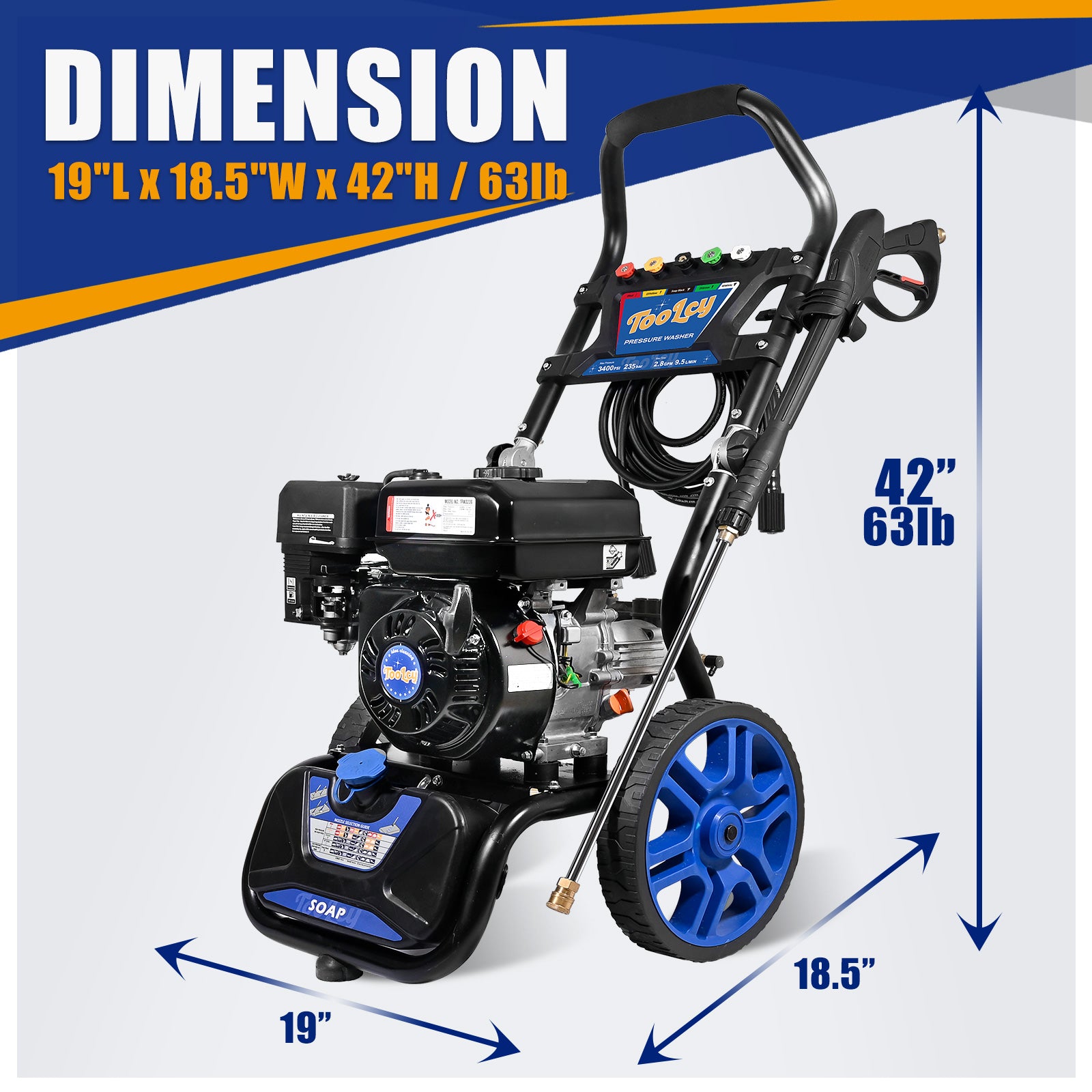 Powerful Pressure Washing: Heavy-duty gas pressure washer with a 212cc 4-stroke engine and durable pump, delivering 3400 PSI and 2.8 GPM for effective cleaning of decks, patios, siding, and more.
