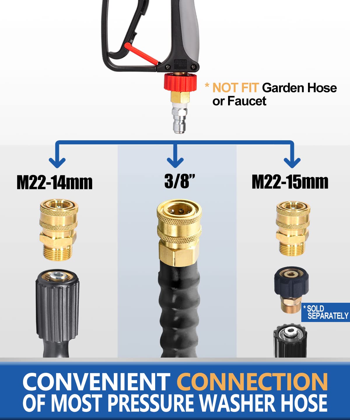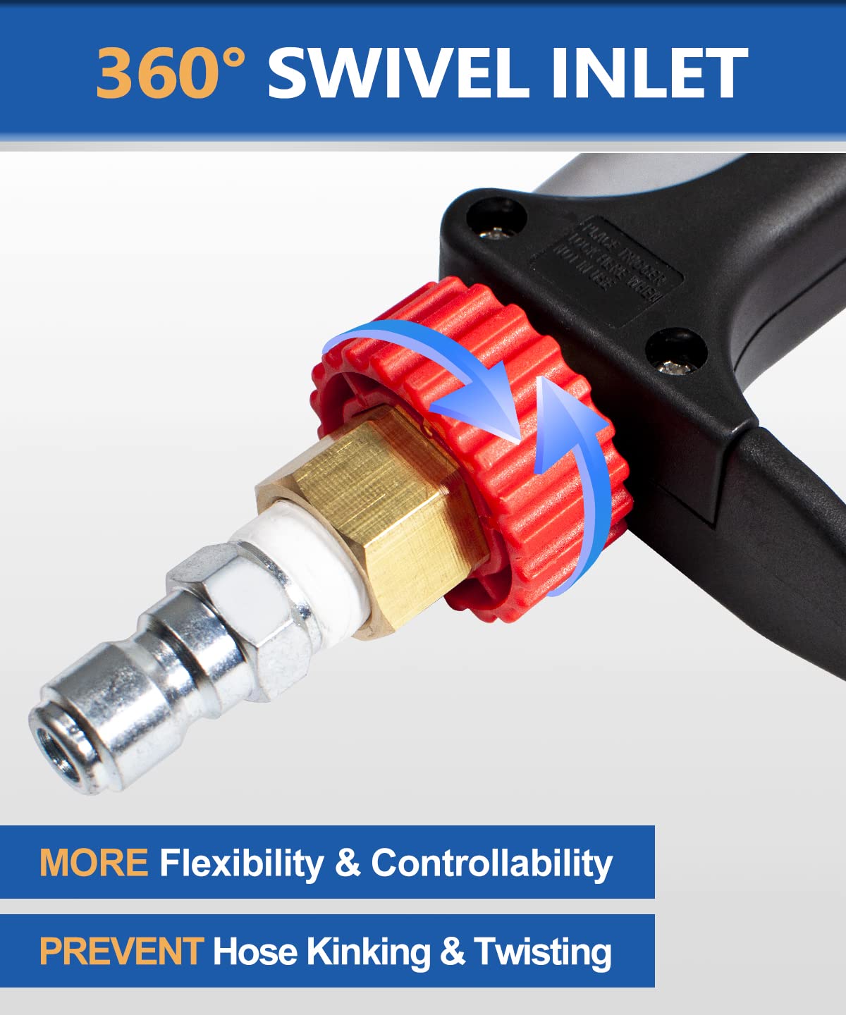 - Durable 5000 PSI pressure washer gun with a swivel connection.