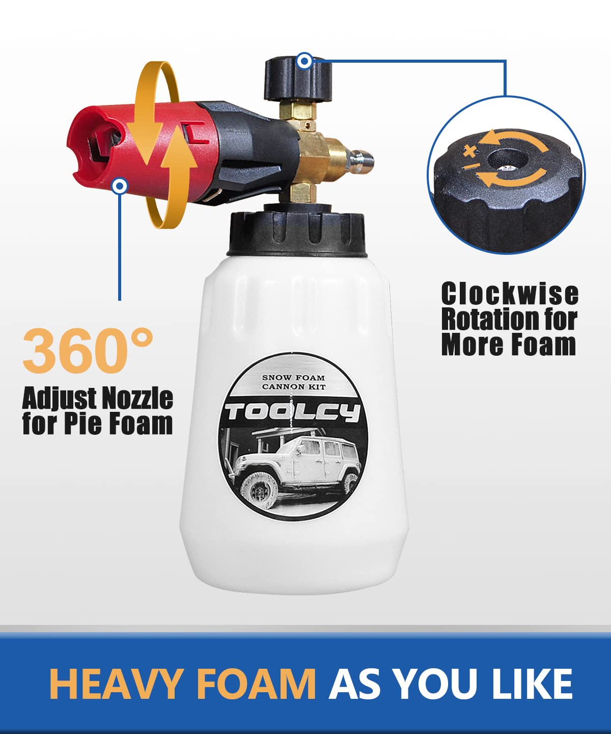 - Includes 1L foam cannon, 5000 PSI pressure washer gun, 5 nozzle tips, and M22-14mm male coupler.