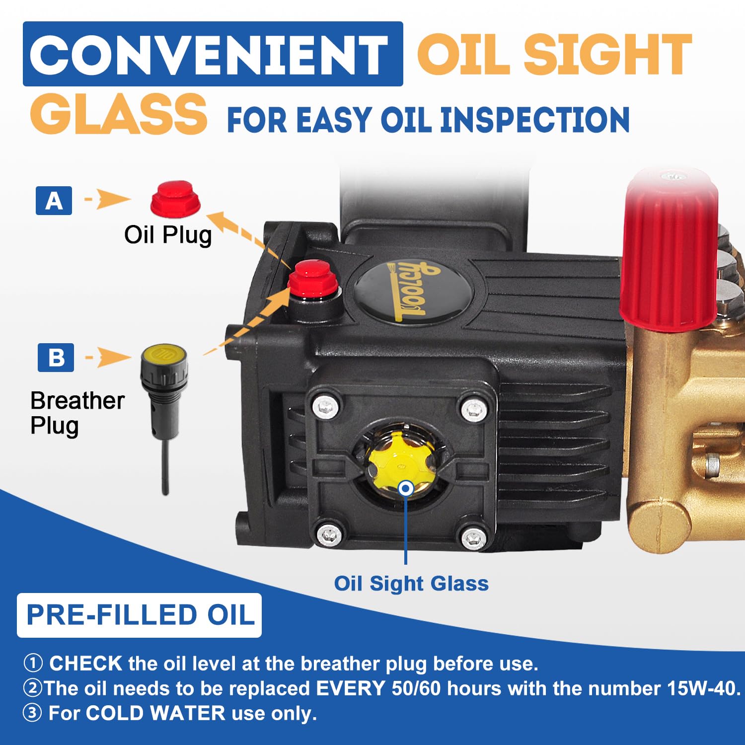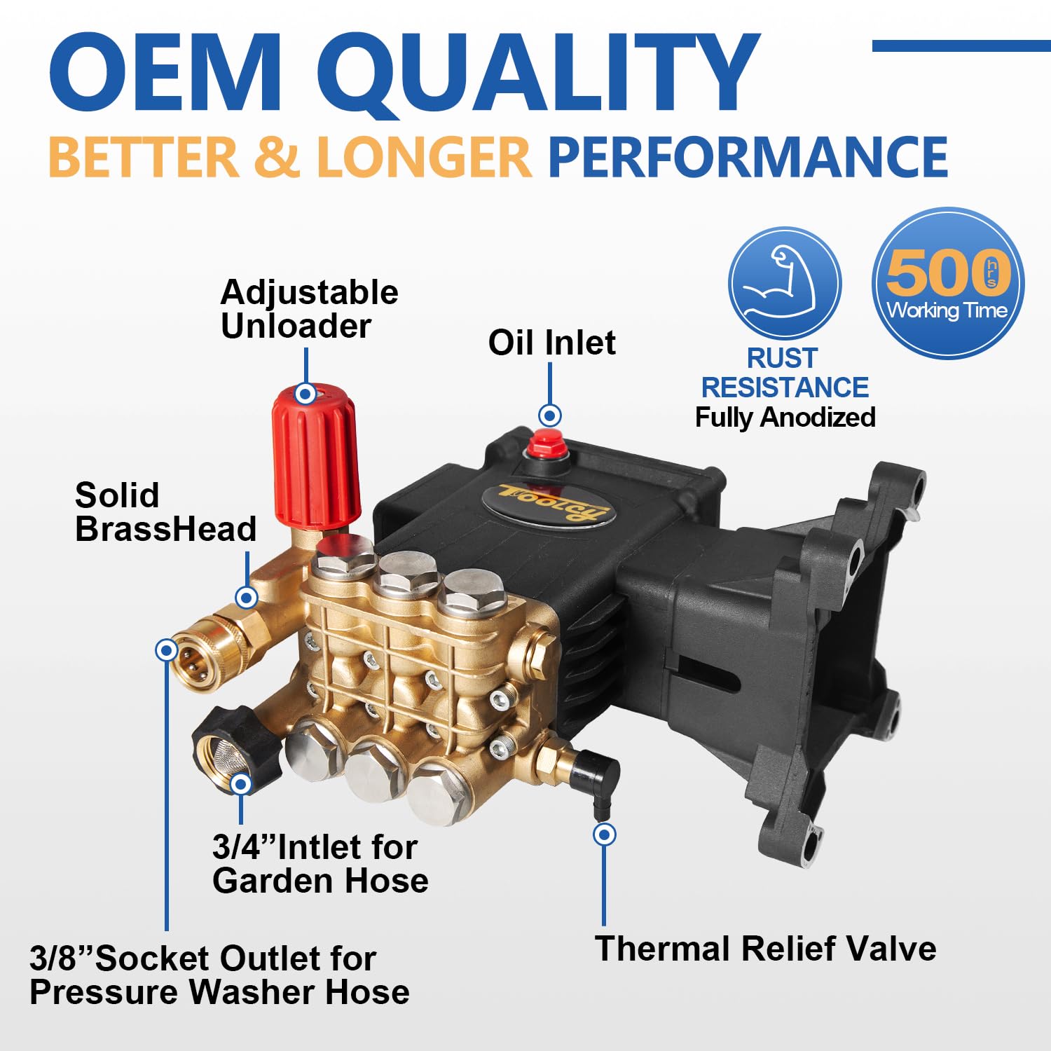 - Anodized black crankcase with solid brass pump head for durability.