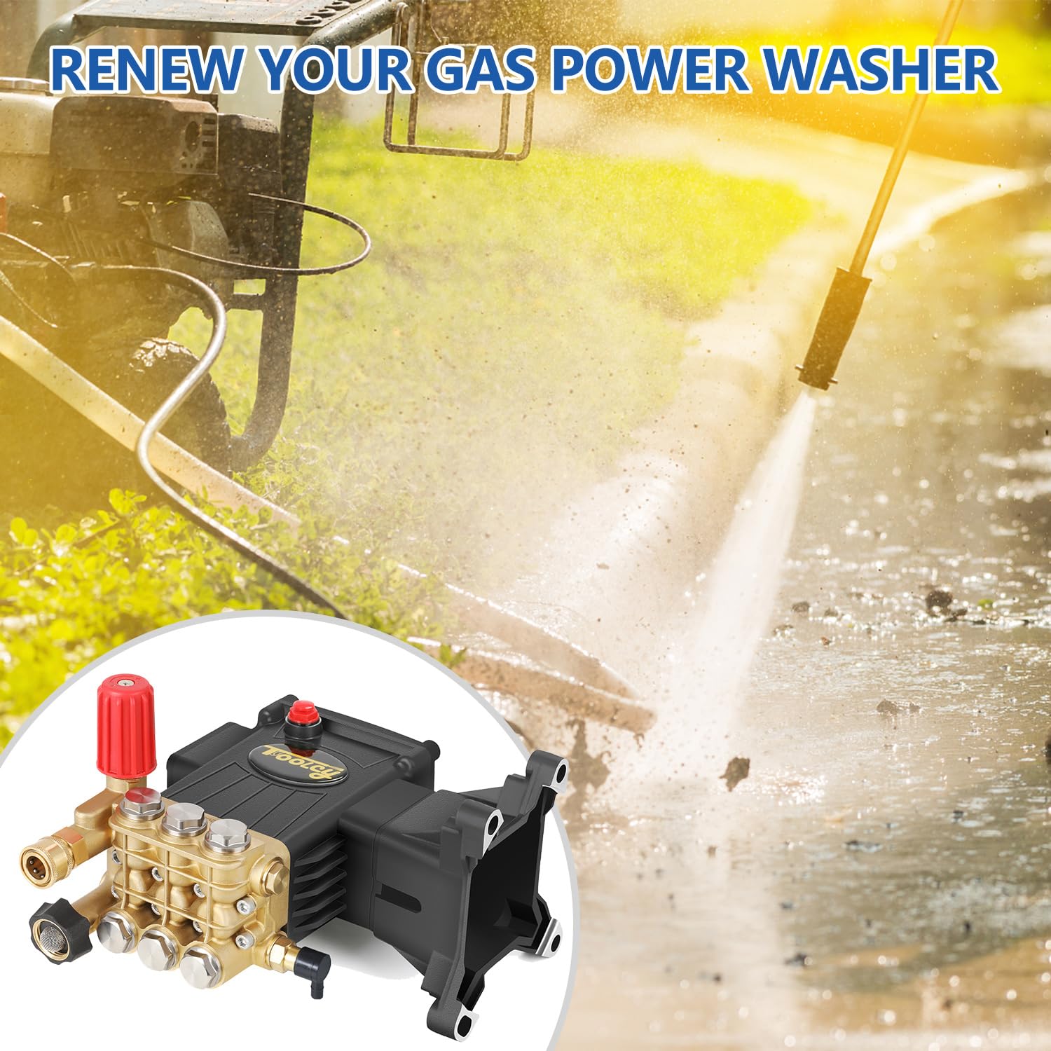 - Premium triplex plunger pump for gas power washers with 1" shaft, 10-15HP, or 270-420cc engine.